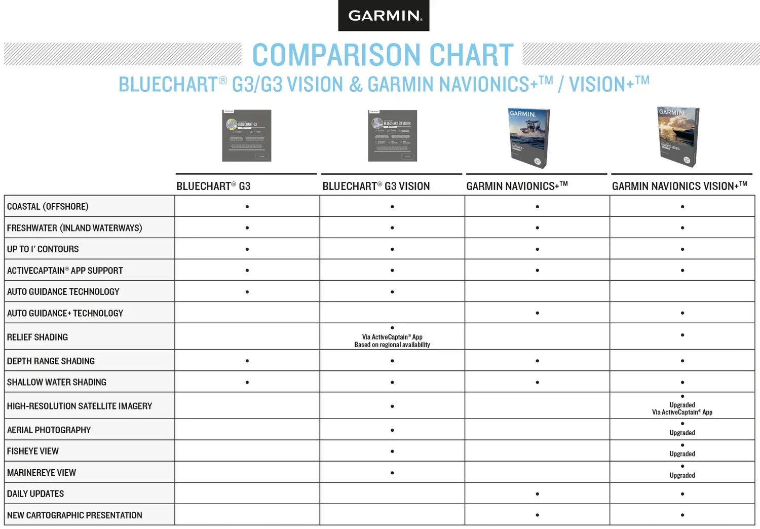 Päivitetyissä kartoissa on integroituna Garmin- ja Navionics® -sisältö. Kartoissa on myös Auto Guidance, joten voit syöttää syvyys- ja korkeustiedot, joiden perusteella kartta laskee reitin ja tekee reittiehdotuksen. Edellä mainittujen ominaisuuksien lisäksi BlueChart g3 Vision kartoissa on realistisen näkymän ympäristöstä tarjoavat satelliittikuvat. Ainutlaatuiset 3-D -näkymät, MarinerEye ja FishEye, antavat lisäperspektiiviä niin vedenpinnan ylä- kuin alapuolellakin.