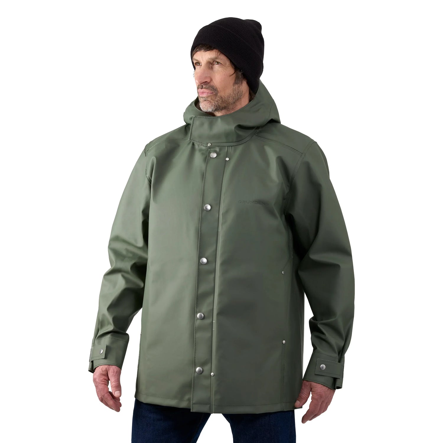 Grundens 1926 Regnkläder Coat Stone Moss sadetakki yhdistää perinteet ja suorituskyvyn – täydellinen valinta, kun haluat erottua tyylillä, mutta pysyä kuivana kaikissa olosuhteissa.