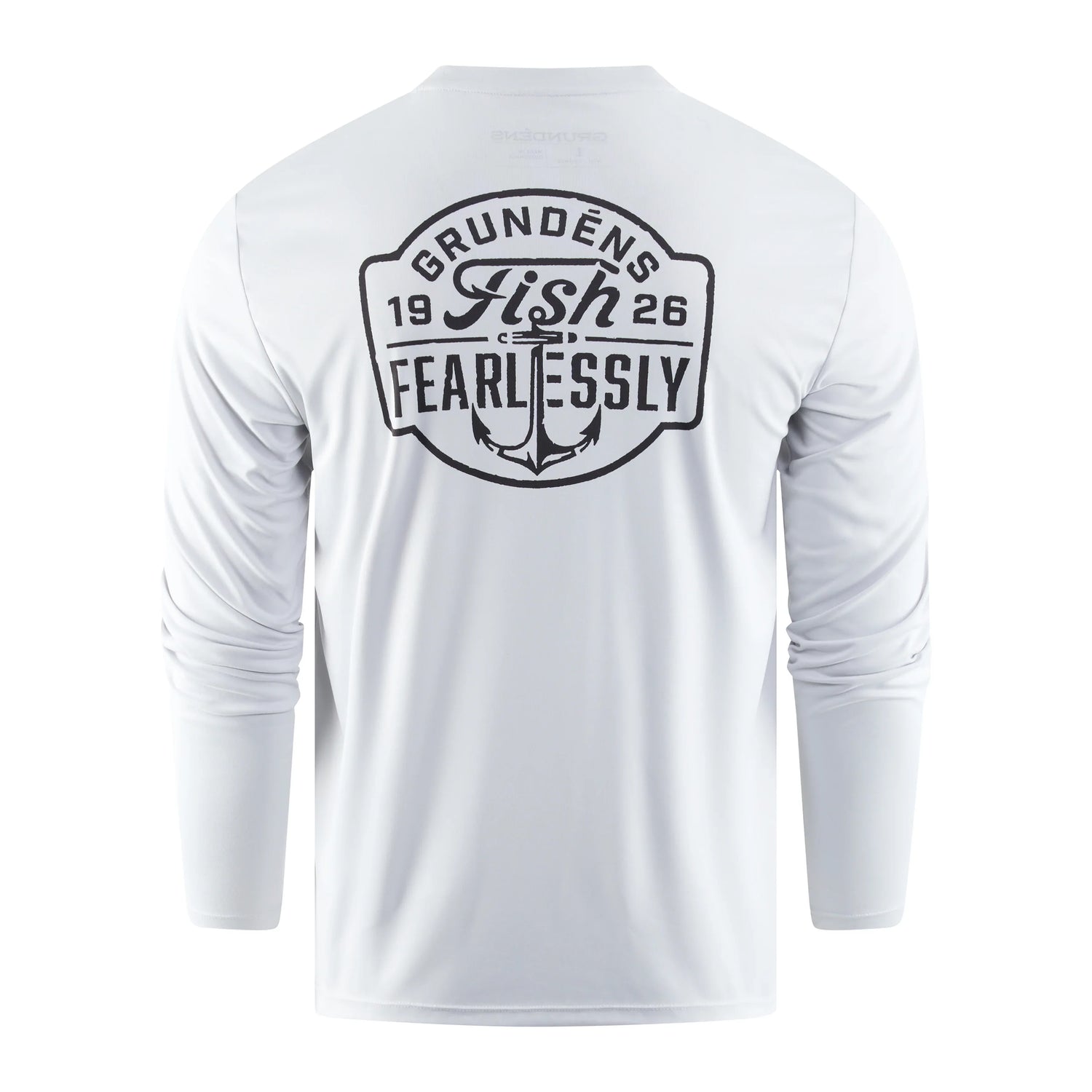 Etupuolella hillitty Grundéns-logo, ja takana näyttävä printti ankkurilla, vuosiluvulla 1926 ja rohkealla sanomalla, joka kuuluu jokaiselle tosikalastajalle – pelotta veteen.