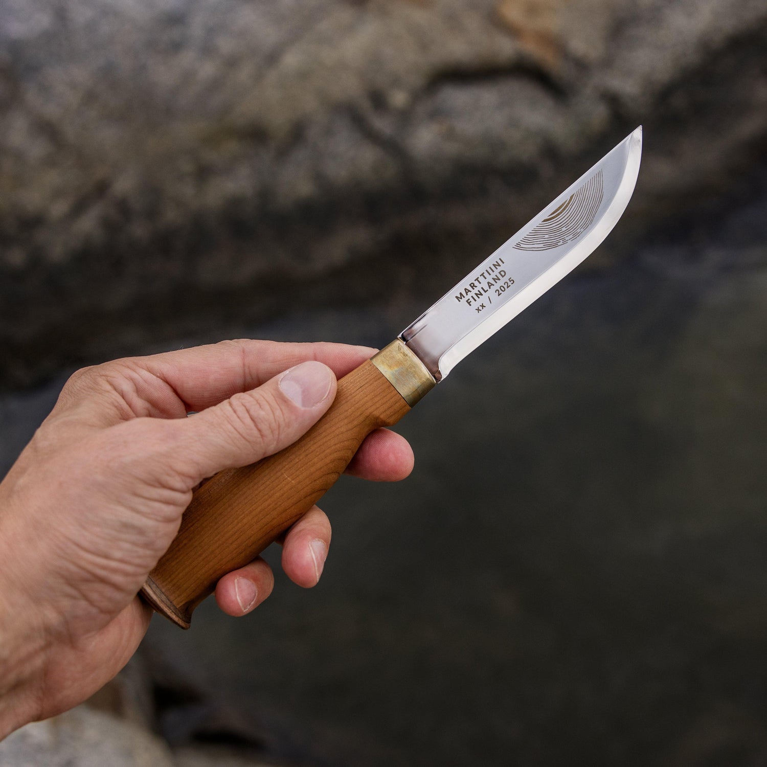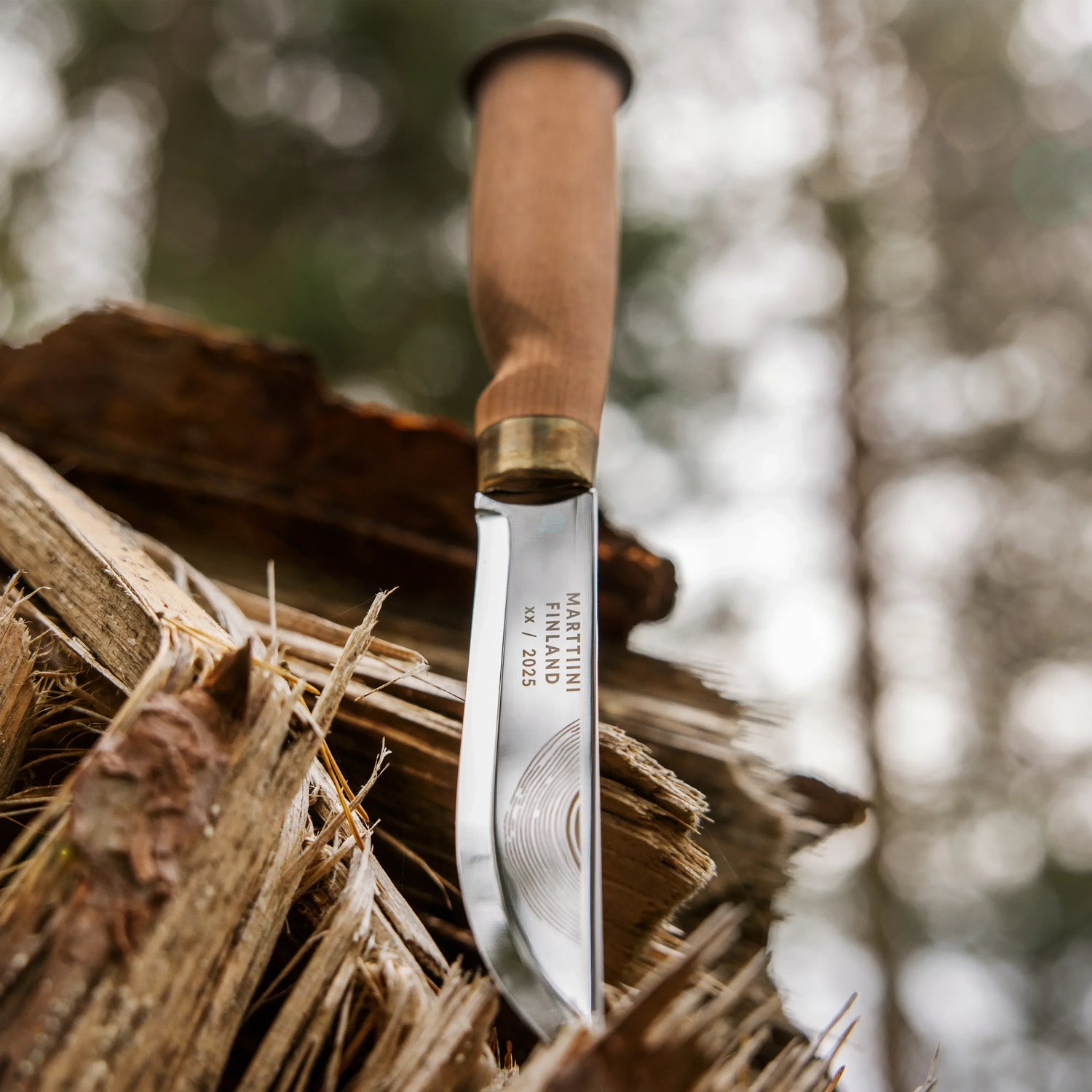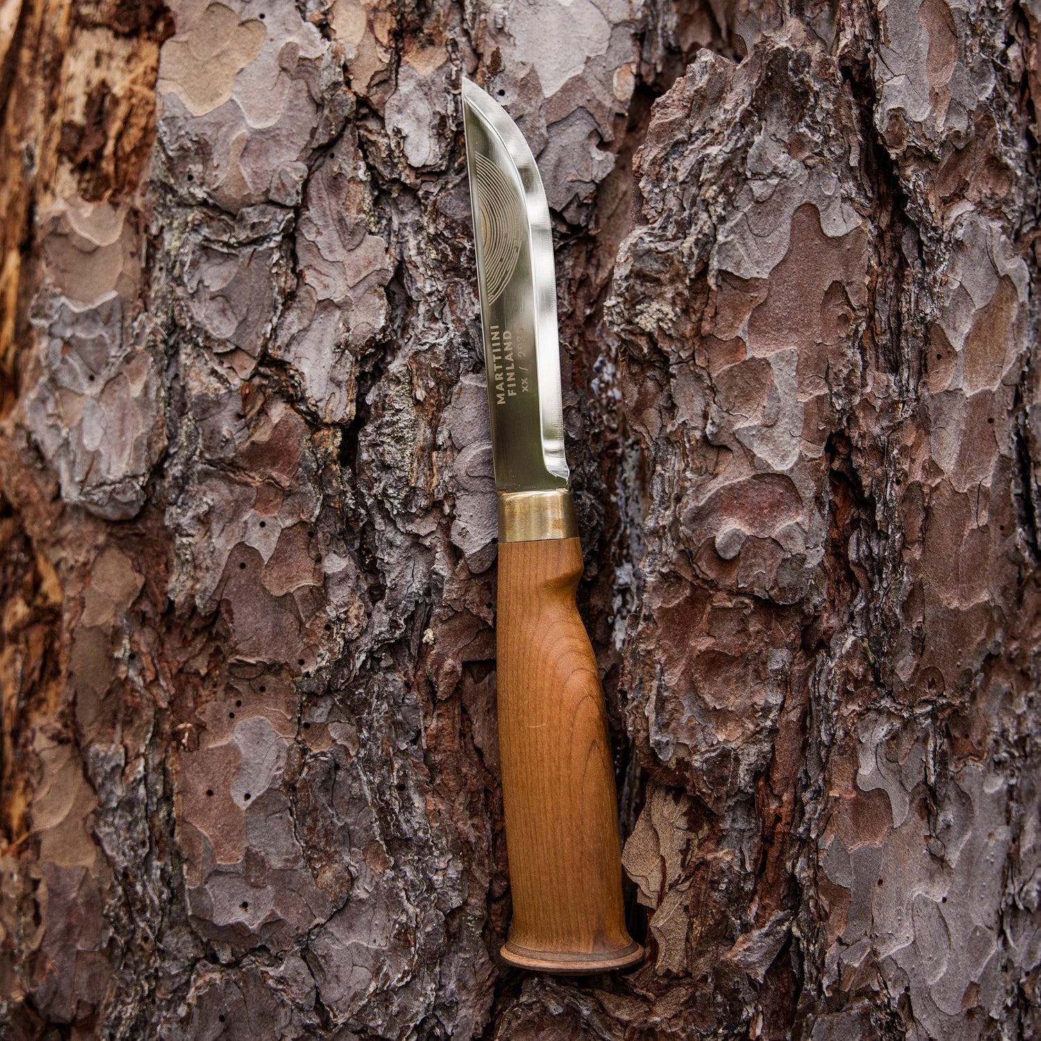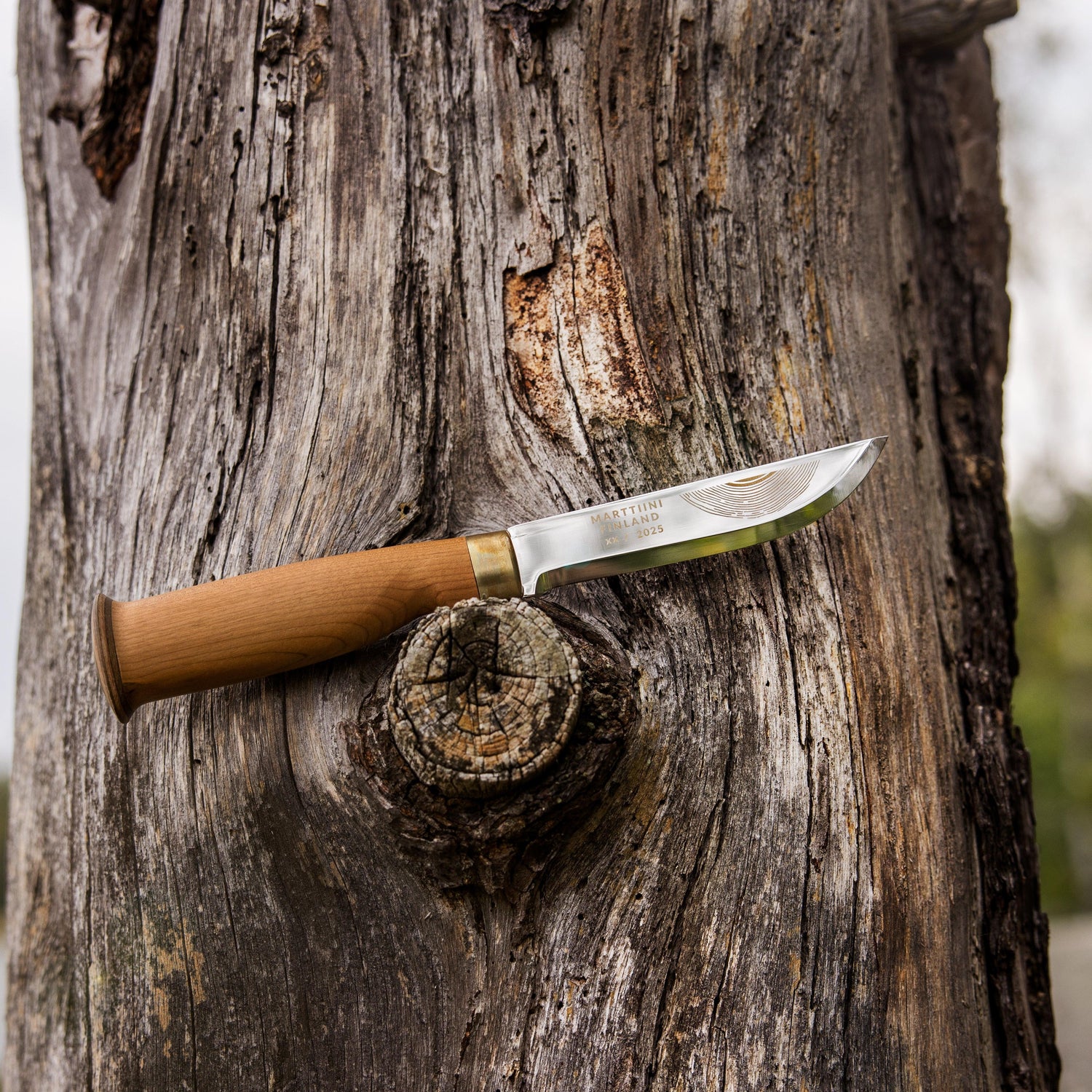 • Uniikki muotoilu: Vuosirenkaat toistuvat puukon ja tupen kuvioinneissa, ja jokaisen kahvan vaneripääty on yksilöllinen, tehden jokaisesta puukosta ainutlaatuisen.
