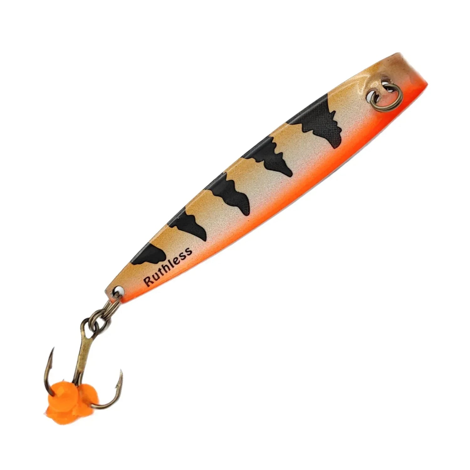 Vieheen pyyntitehokkuus perustuu pilkin epäsymmetriseen ja ennalta arvaamattomaan uintiliikkeeseen. Ruthless Pystypilkin vetopiste sijaitsee poikkeuksellisesti vieheen rungon keskiosassa. Pystypilkkiä uitettaessa viehe ”hakee” voimakkaasti puolelta toiselle vetopisteen sijainnista johtuen. Pilkin koveran rungon ja kiilamaisen muotoilun ansiosta se vajoaa pudotessaan vaakatasossa välkyttäen kylkiään vastustamattomasti. Ruthless Pystypilkin kolmihaarakoukkuun on kiinnitetty kalastustehokkuuden maksimoimiseksi Orka Fish Roe mätipalloja, jotka luovat koukkuun räikeän iskupisteen. Ruthless Pystypilkit valmistetaan ja maalataan käsityönä Euroopassa.