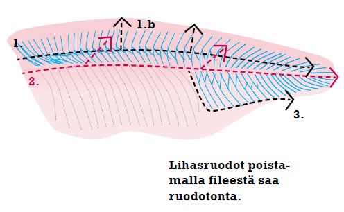 Näin voit hyödyntää myös muita kookkaita särkikaloja. Fileoi Toutaimen (Leuciscus aspius) kala selän kautta leikkaamatta kylkiruotoja irti selkäruodosta. Kuljeta veistä ruotojen pintaa pitkin ja irrota kylkifileet kalan sisäosasta. Selän lihasruodot voit halutessasi poistaa. Paikallista lihasruotojen päät ja leikkaa ruotorivin mukaisesti viilto lihasruotojen y-haaraan asti: kuvassa #1. Käännä terän kulkusuunta ruotojen mukaisesti selän suuntaan ja saat irti selän mittaisen ruodottoman filepalan: #1b. Leikkaa lihasruotopala irti suuntaamalla leikkaus kylkiviivalta kohti lihasruotojen alapintaa ja viillä niiden alapintaa pitkin ruotopala pois: #2. Peräpään ruotopala leikataan irti: #3. Ruotoiset osat voit jauhaa kalapulliin tai -pihveihin. Ruodottomat palat leikataan pitkulaisiksi ”sormipaloiksi” ja suolataan.
